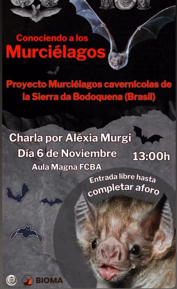 [... Leer más ]La Asociación de Amigos de la Biología (BIOMA) ha organizado para el jueves 6 de noviembre, en el Aula Magna de la Facultad de Biológicas a las 13:00 horas, la charla 'Conociendo a los murciélagos: Proyecto Murciélagos cavernícolas de la Sierra da Bodoquena (Brasil)', impartida por Aléxia Murgi.