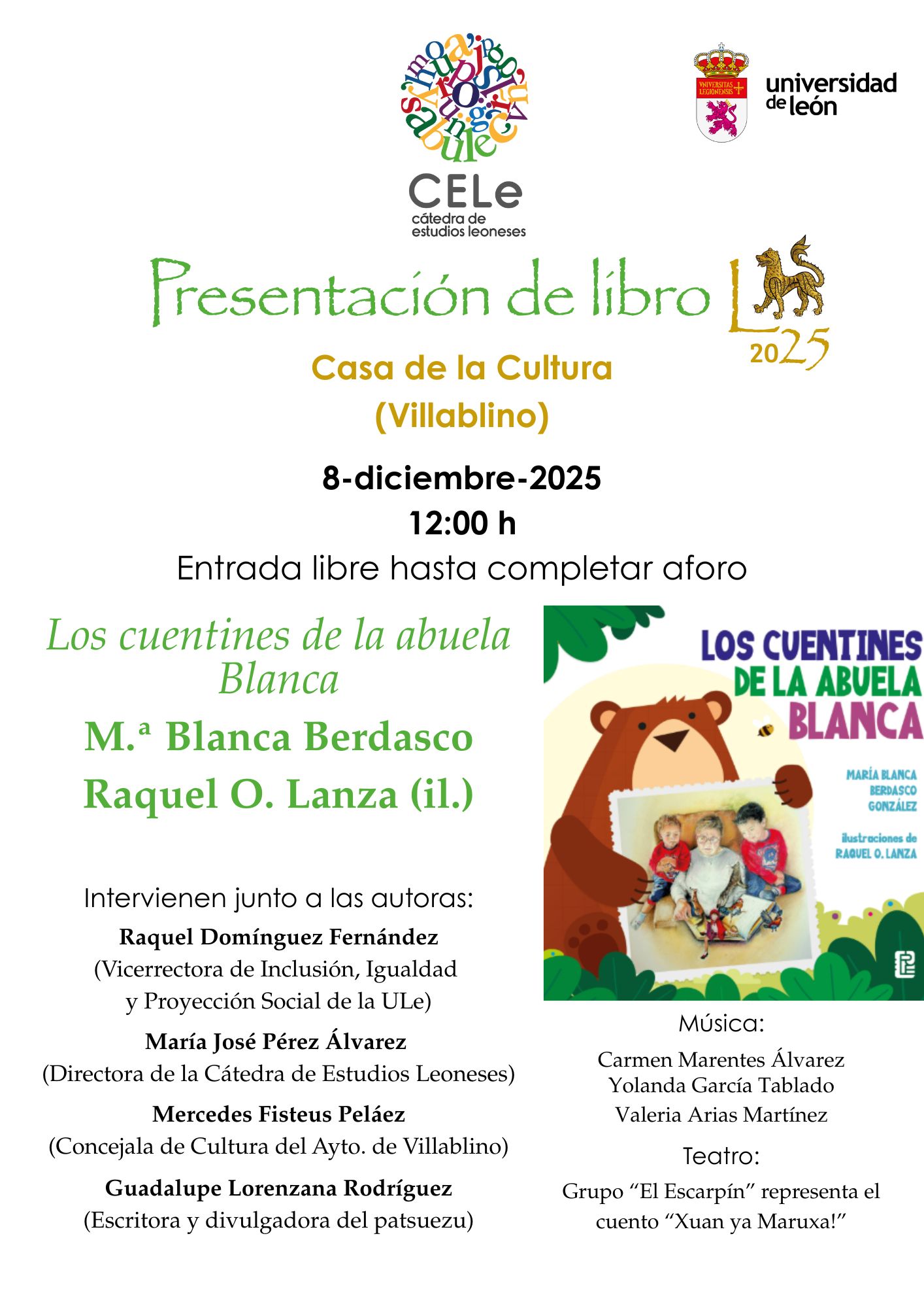 [... Leer más ]La Cátedra de Estudios Leoneses (CELe) de la Universidad de León presenta el 8 de diciembre, a las 12:00 horas, en la Casa de Cultura de Villablino, el libro 'Cuentines de la abuela Blanca' , de Mª Blanca Berdasco con ilustraciones de Raquel O. Lanza. En el acto, de entrada libre hasta completar aforo,