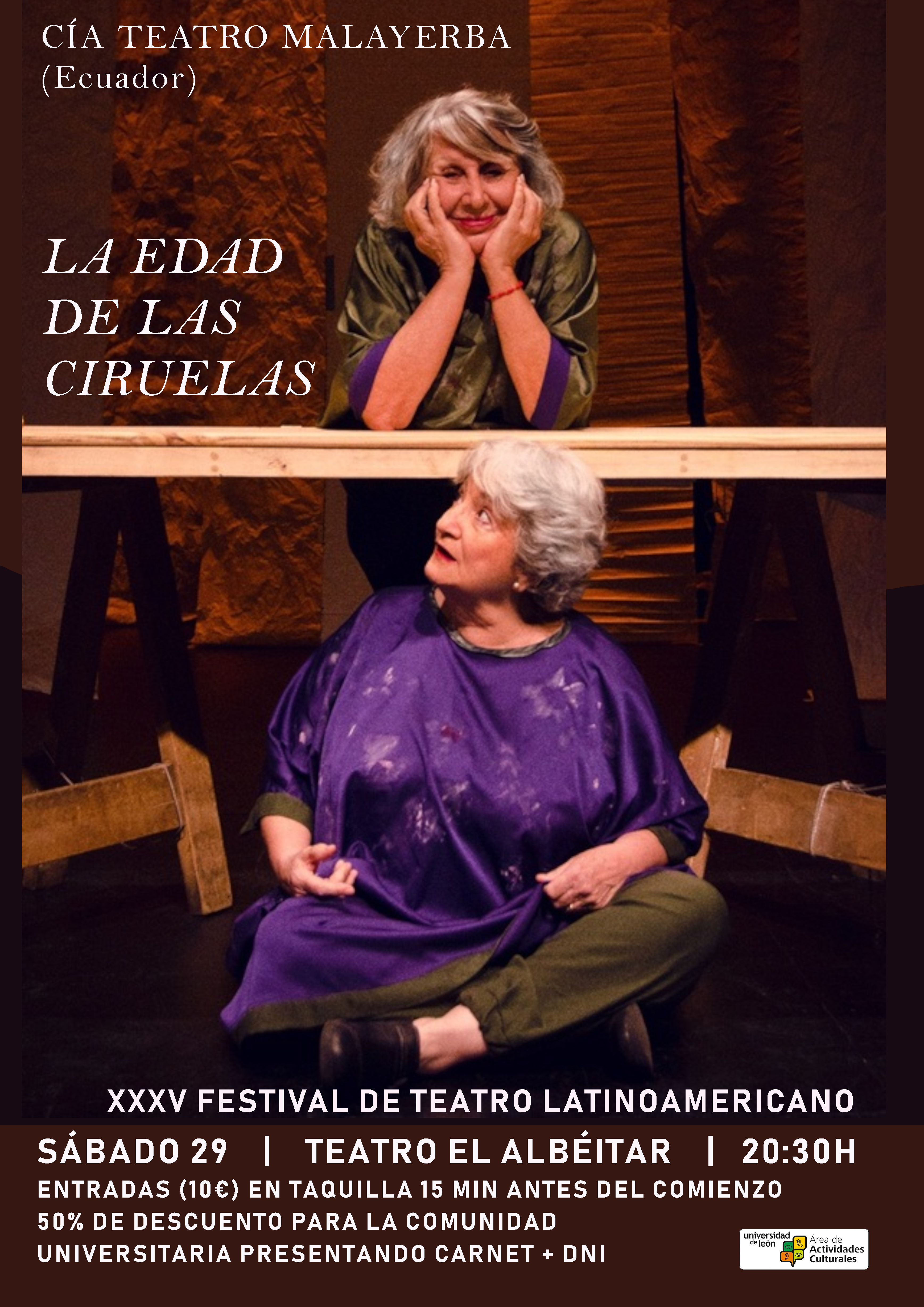 Entradas (8 €): a partir de media hora antes de la función en la taquilla del teatro50% de descuento: Comunidad Universitaria, previa presentación de carné universitario y DNI.
